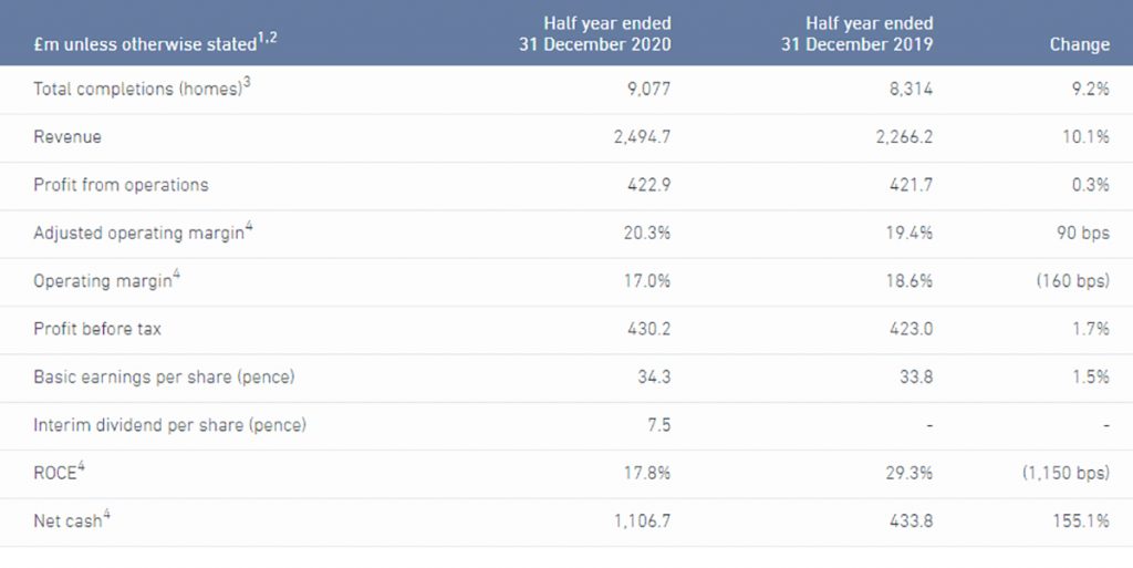 - Recovery in adjusted operating margin to 20.3% (2019: 19.4%, H2 FY20: 5.9%) mainly driven by growth in completions, delivering adjusted profit before tax of £507.2m (2019: £440.8m). After adjusted items of £77.0m (2019: £17.8m), profit before tax was £430.2m (2019: £423.0m)
